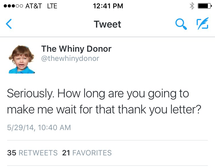 As a donor, I completely understand The Whiny Donor’s willingness to walk away from support after she complains about something and doesn’t receive an adequate response. But it’s not typical. The reality is that most donors won’t bother to complain to you directly. They will simply ghost away and you won’t ever see another $1.
