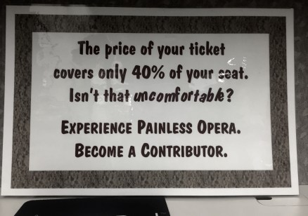 The thinking goes something like, “Friend, the cost of your ticket (that you paid for with your hard earned money at the price we proposed) ACTUALLY ONLY REPRESENTS a fraction of the true cost of producing the performance for which you’ve joined us this Evening. And so you, as a Decent Person, should be wracked with Regret for not paying your fair share. And so Give Us Your Money. You misanthrope. You fiend. You Cheapie.”